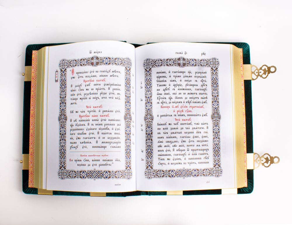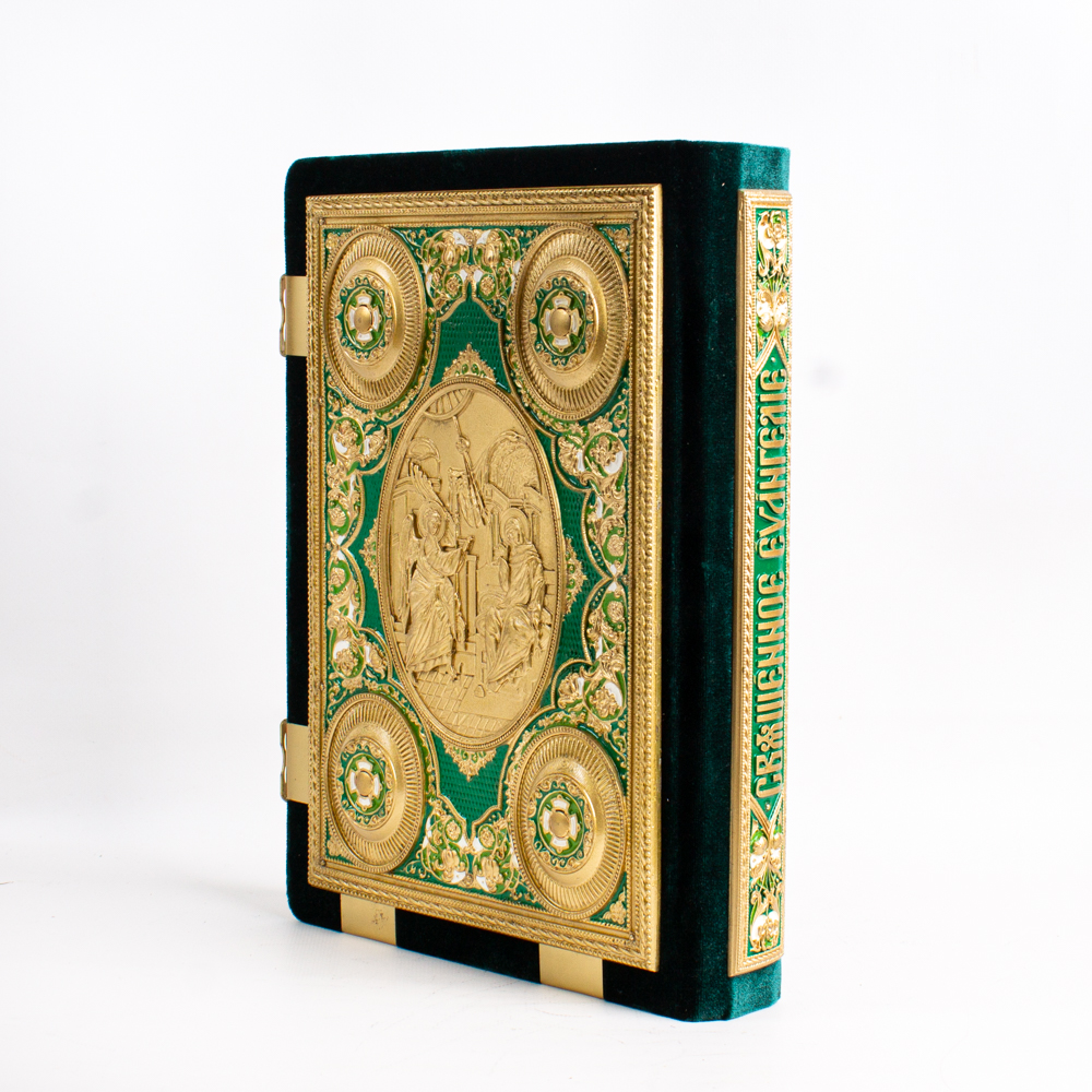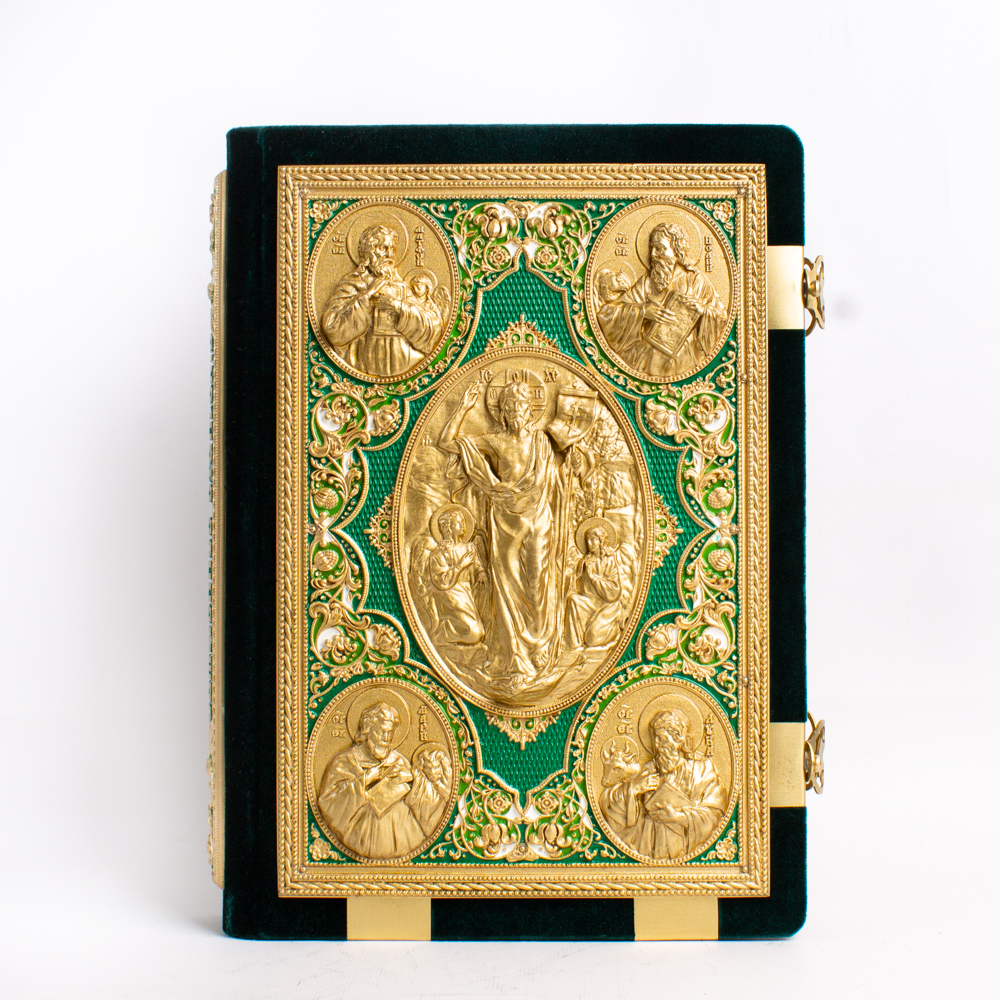 Напрестольное Евангелие большого формата в бархате и окладе с росписью эмалью (зеленый цвет) и с двумя металлическими застежками. Текст отпечатан традиционным церковным шрифтом в две краски, богато украшен изящными буквицами и орнаментами, выполненными в традицияx древнерусскиx книг, содержит церковные зачала, указатель Евангельских чтений, а также 12 Евангелий Святых Страстей Господних. Использована качественная офсетная бумага, посеребренный обрез. На лицевой стороне оклада представлено изображение Воскресения Христова, образы четырех евангелистов, а на оборотной – Благовещение Пресвятой Богородицы.