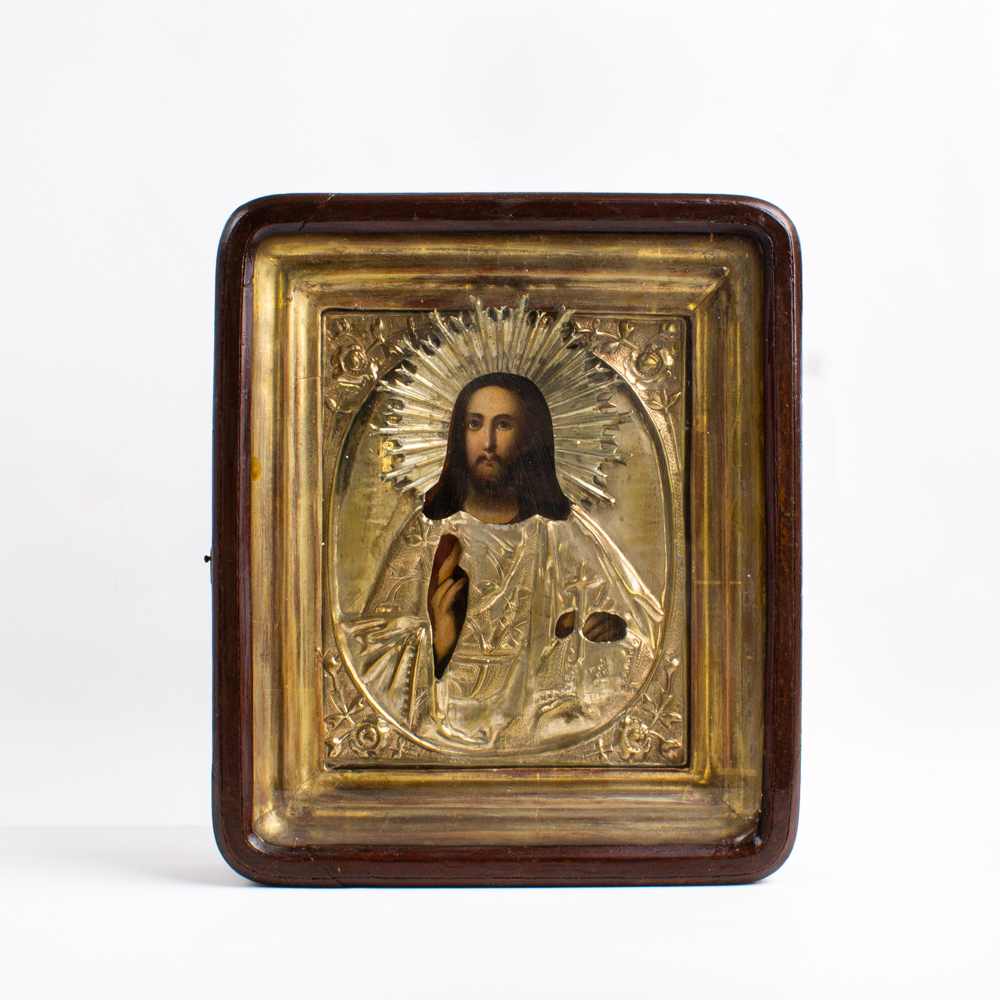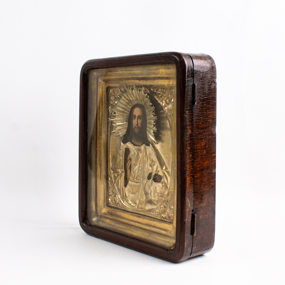 Икона Господь Вседержитель 14х17 оклад, киот 19 век