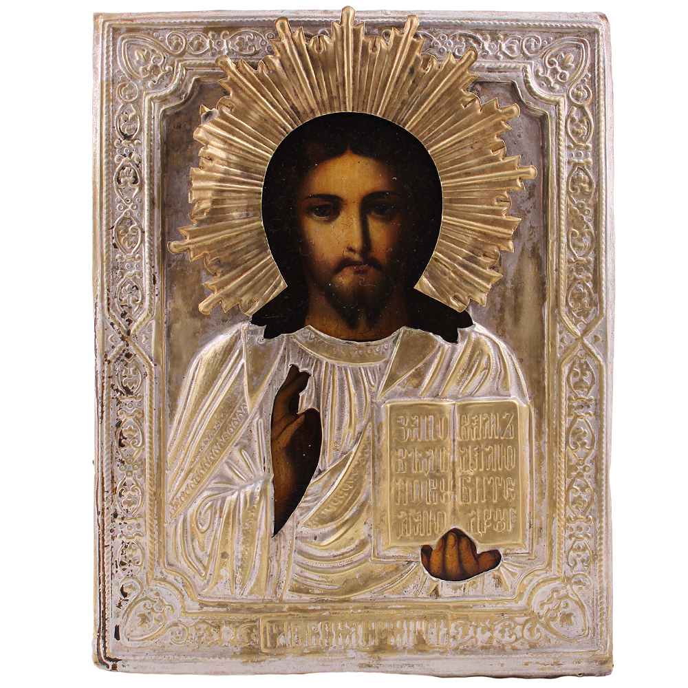 Икона живописная Господь Вседержитель 18х23 оклад 19 век