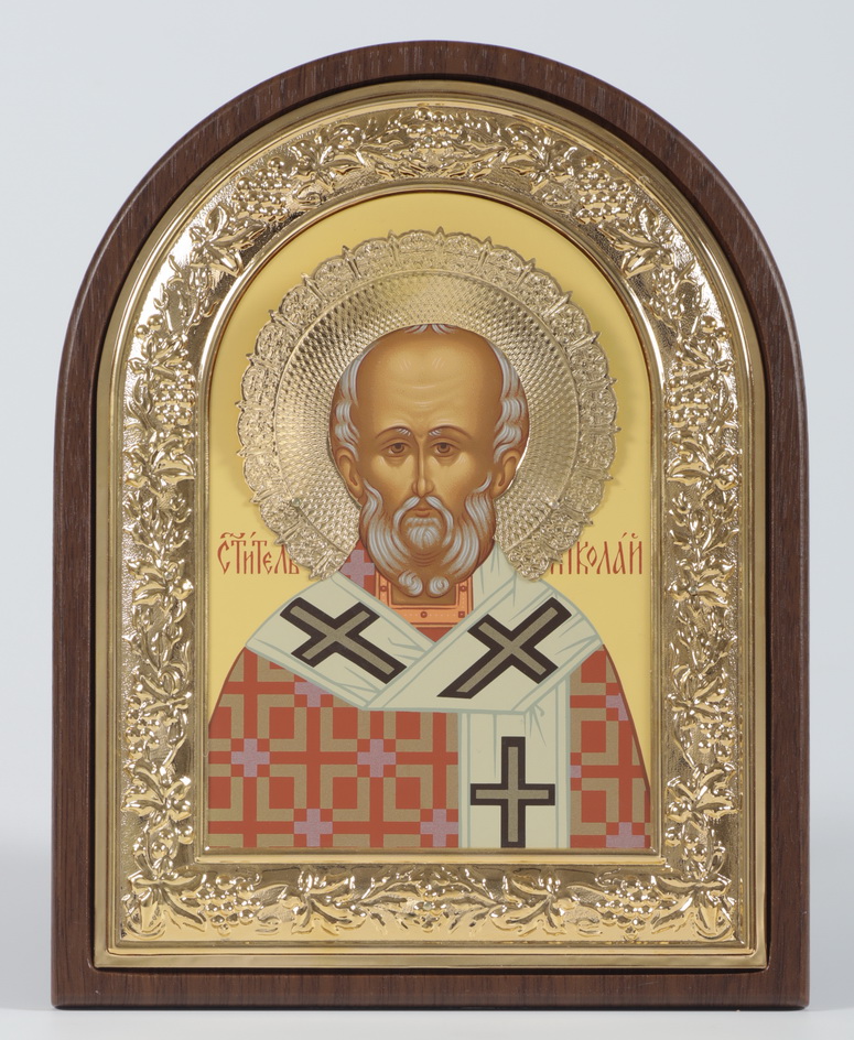 Икона в ризе 18*24 арочная, планшет, рамка,венчик зол., темпера Николай Чудотворец