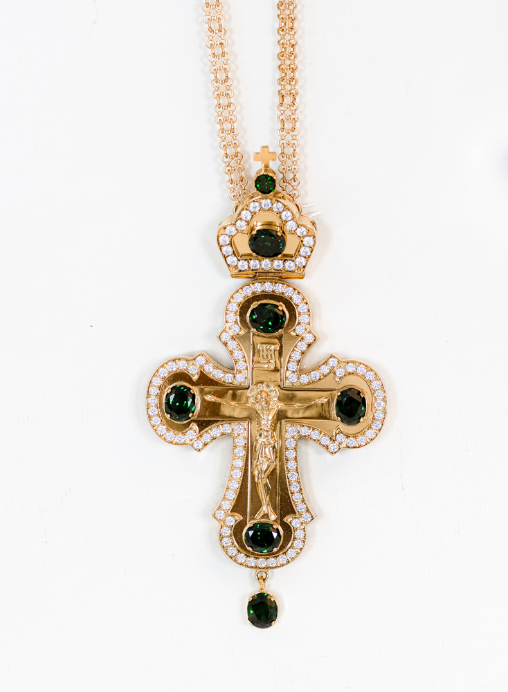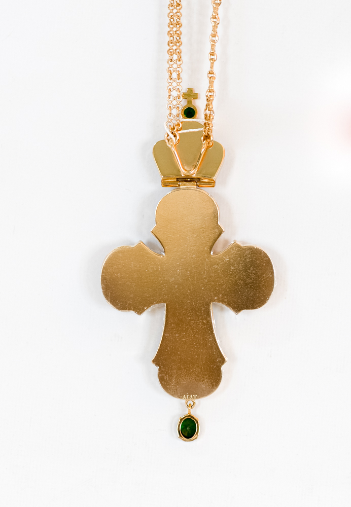 Крест латунь, позолота, цепь, вес 231,24 камни зеленые