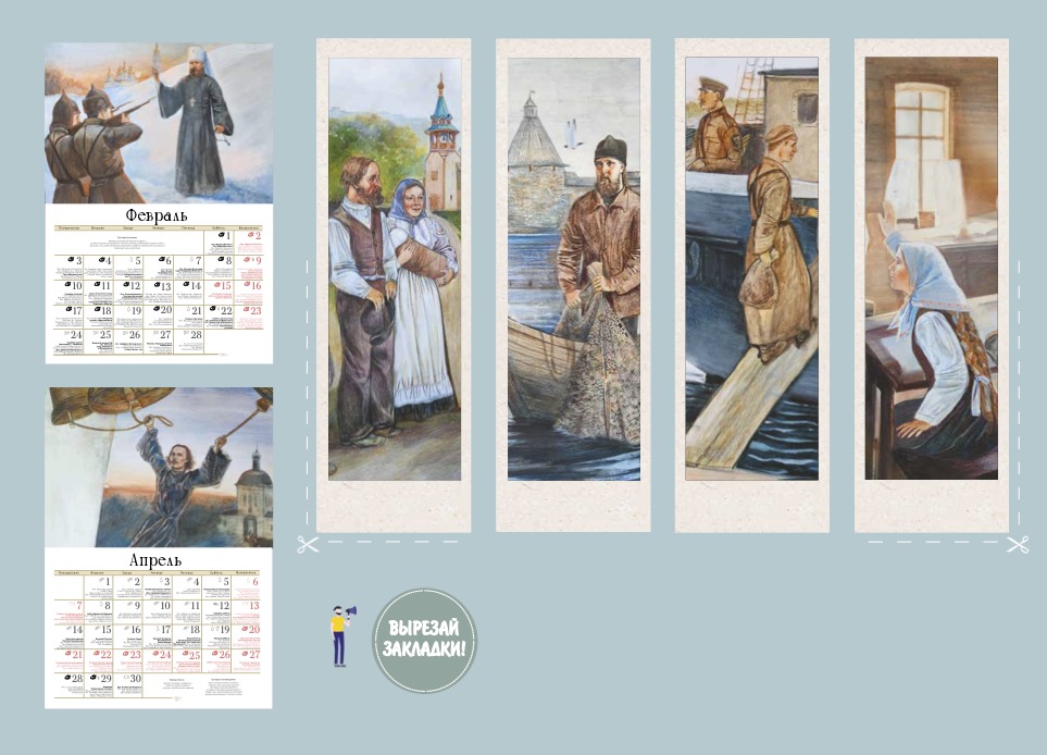 Православный настенный календарь «Новомученики» – иллюстрированный календарь на 2025 год с тропарями главных праздников, краткими житиями новомучеников и исповедников ХХ века. Художник Анастасия Жунина. На обороте издания приятный бонус – закладки с фрагментами картин.