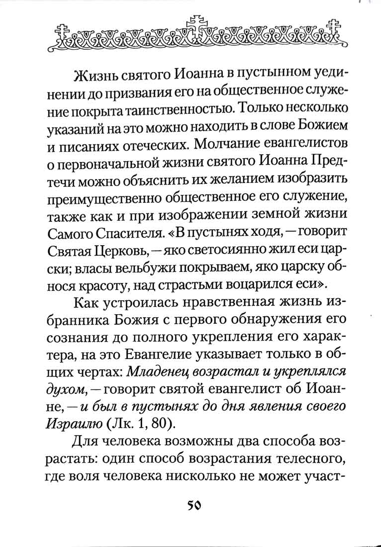 Книга «Святой Великий Пророк Предтеча и Креститель Иоанн» составлена в соответствии с ходом евангельских событий и отличается широтой охваченных тем. На ее страницах представлена историческая действительность, в которой проповедовал Предтеча Господень, объяснены ветхозаветные священнодействия и обряды, дана характеристика правителям Палестины и последователям раввинского учения: фарисеям, саддукеям и ессеям.
